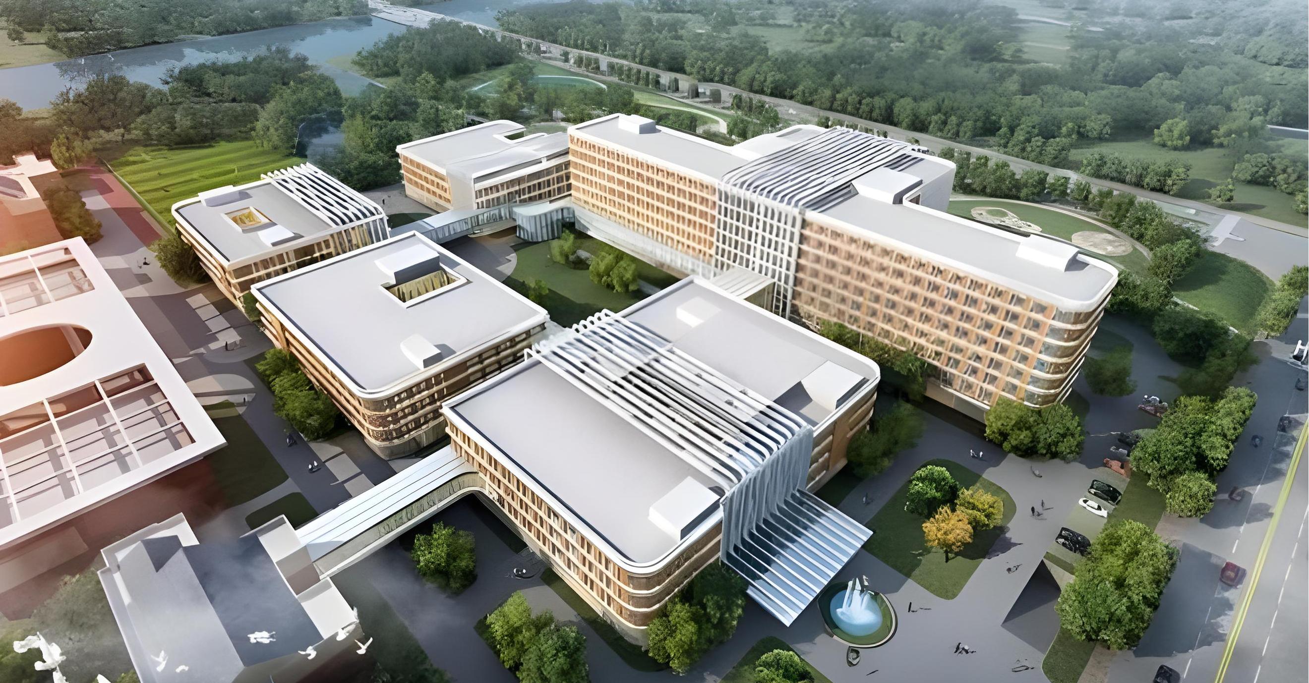 醫院占地面積396畝,總建筑面積近15萬平方米,核定床位1000張。此項目為醫院二期工程,總建筑面積近10萬平方米。